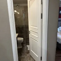 2) bathroom glass door some push some pull ? and the wood door can’t keep touch with the wall