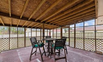 Enjoy the beautiful Carolina weather on the back patio, featuring a dining space for al fresco meals or morning coffee. The large driveway provides ample parking space for multiple vehicles, ensuring convenience for your stay.