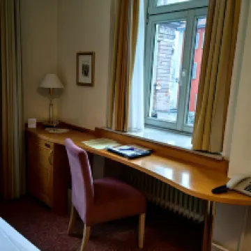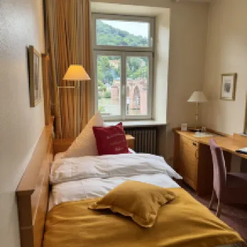 The price of €160 per night (including €10 for breakfast) mainly covers these five unbeatable locations: by the Neckar River, next to the Old Bridge, with views of the bronze monkey right from the window. The traditional, compact single rooms are perfect for solo travelers. The breakfast is highly recommended and very generous.