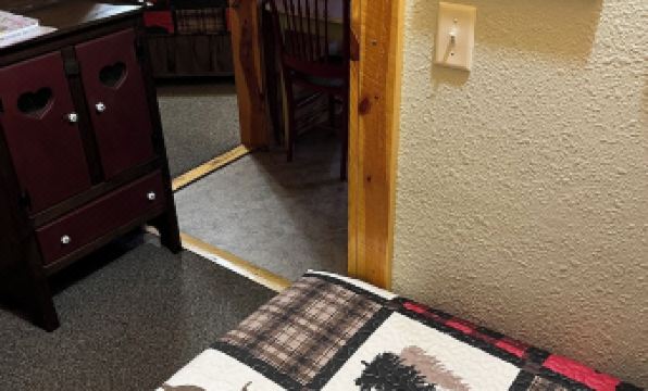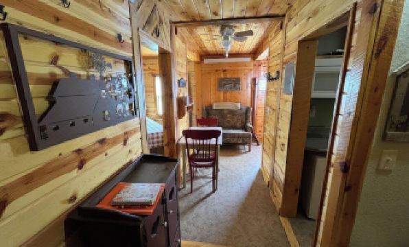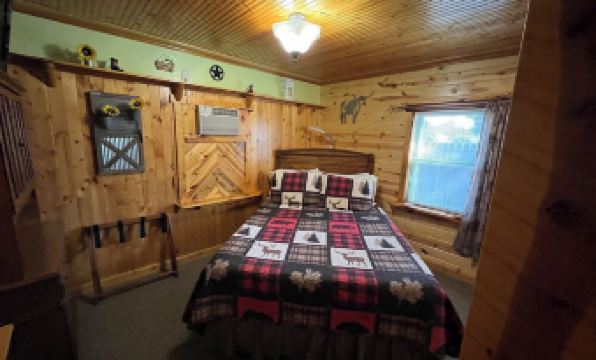 Elkhorn Mountain Suite at Mountain Peaks Inn is a knotty-pine wrapped cabin with its own entrance, which sleeps up to four guests (THREE Adults and ONE Child). The suite has one queen bed and one twin bed. Additionally, there is a small 5’4” sleeping loft for a small child to enjoy. This suite has a personal deck with charcoal grill, full bathroom, a kitchenette with a sink, mini-fridge, microwave, toaster, coffeepot, tv/dvd, Roku stick, and AC. While there are no doors dividing the sleeping areas, there is a curtain that provides privacy.