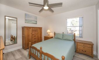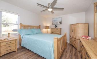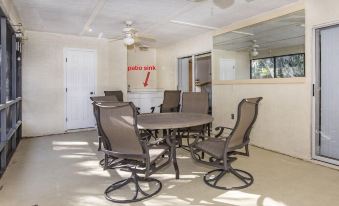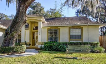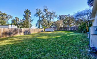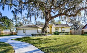 Tastefully updated in January 2022 with quartz counter-tops, laminate floors, fresh paint throughout and all new linens and mattresses. Super clean home with everything you would expect at your own home. Prepare meals in the large kitchen with 4 seat bar. The kitchen comes completely equipped with small appliances, cookware, every tool you could ask for, paper products, spices and coffee. Snuggle up to the fireplace in the family room on the brand new furniture or enjoy your coffee out on the large covered, screened-in rear patio with 1/2 bath and wet bar while you gaze out at the beautiful bamboo. Then get your work done in the large fully furnished office with another beautiful view out the front windows. Also a hutch in the living room is provided as an optional workspace. Stay cool under the new remote controlled ceiling fans provided in every room. Catch a game on the 70" Smart HDTV in the family room or on one of the 2 Smart HDTV's in the bedrooms with Roku and High Speed WiFi. The master bedroom is large with tasteful furniture and includes 2 walk-in closets and access out to the rear patio through the sliding glass door. Enjoy the oversized master bath with double vanity, makeup station, walk-in shower and garden tub. Appreciate the in-house laundry room and enjoy the convenience of the 2-1/2 car garage with automatic door opener. Also the driveway has ample parking for 4 cars. Oh and the garage even has a plug-in to charge your Tesla or RV and an air compressor is provided! Large fully fenced back yard (wooden privacy). Beautiful huge live oak shade tree with cozy wooden swing hanging on it with a beautiful view across the road. Simple keyless entry for easy check in and check out. I am a detail person and think of the "little things" that make your stay convenient and comfortable. Some consumables are provided like paper plates, paper towels, laundry supplies, shampoo, basic spices and condiments etc...
