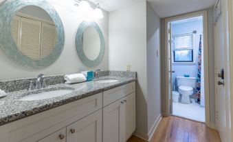 The master bedroom offers a King bed, flat-screen TV, and an ensuite bath with a vanity area and a separate tub/shower. The second bedroom features two queen beds and another full bathroom with a tub/shower combination. Near the entryway is a third full bathroom, which also houses the stackable washer and dryer and a stall shower – the perfect spot for rinsing off after a day at the beach!