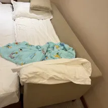 Once we were back in the room, they decided to move the sofa next to the smaller bed, which just about made enough space for the two children to sleep. The receptionist then brought an extra duvet to place on the sofa.