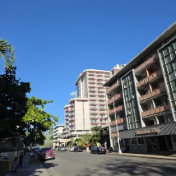 Good points: Kitchen and tableware provided. Convenient location right next to the International Market. A bit old, but spacious and clean room. Everyone at the front desk is friendly. Free activities like lei making. Beach towels available for rent. Free parking. Pool included.