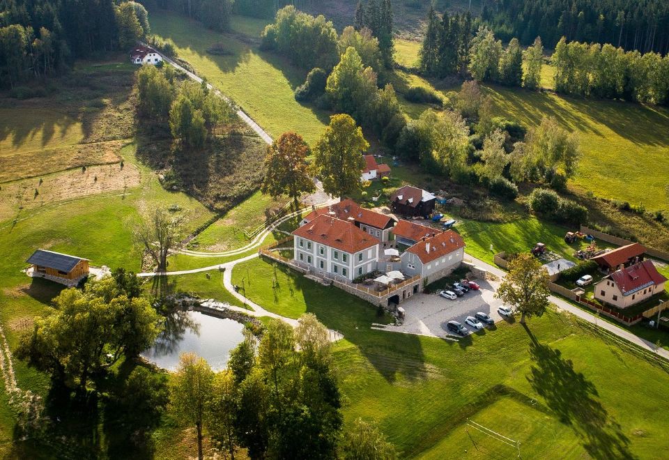 War für 3 Tage in diesem wunderschönen Hotel und hatte am liebsten 6 Sterne vergeben wenn ich nicht enttäuscht gewesen wäre über das Zimmer. Ich war in einem der 2 neuen Häuser mit Studios untergebracht und fand die Einrichtung einfach nur mega, wunderschön und originell. Es war alles da, was man brauchte und die Größe war ebenfalls wunderbar. Aber dann kam der Abend und die Nachbarn. Man konnte seltsamerweise jedes Wort verstehen (ich nicht, weil ich kein tschechisch spreche :-) , und es ging bis Mitternacht und morgens ab 6. Trotz Ohrstöpsel wachte ich von den Stimmen auf. Es klang so, als ob sie in meinem Studio wären. Sehr schade, denn alles andere war einfach nur perfekt. Das Frühstück war sehr abwechslungsreich in Form eines Buffets, welches ständig nachgefüllt wurde. Es gibt 2 Zapfstellen für Limo und Bier auf dem Gelände, wozu man Münzen einwerfen muss. Toll, wenn man zwischendurch Durst hat. Es gibt kein Restaurant, aber Freitag, Samstag und Sonntag hatte unterhalb neben der Straßenkreuzung eine kleine Scheune auf, wo man zwischen 15 und 20 Uhr Getränke und Snacks, wie Pizza, Suppe, gefüllte Teigtaschen und Kuchen bekommen kann. Das Gelände ist riesig, mit Wellnessbereichen, dem kleinen süßen Teich, Spielplätze, kostenfreie und genügend vorhandene Parkplätze sowie einem kleinen Zoo mit 2 Eseln, Hühnern und Schafen. Für Kinder wunderbar zum Streicheln, für Hunde wunderbar zum Herumtoben auf großflächigen Wiesen. Also sehr zum empfehlen, aber mit den Zimmern aufpassen. Besser bzw. ruhiger sind sie wohl in den älteren Hauptgebäuden mit zum Teil schönen Ausblicken auf den süßen Teich.