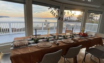 The main features of this home are unbeatable views of Skagit Bay from nearly every spot in the home, a roomy ~3,000 sq ft of space, wraparound deck, and a large yard and outdoor area. There is also a dedicated closed-door, quiet office space available, with desk, to extend your visit into a workweek.