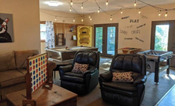 We just made new changes to the "Garage" space and converted it into a Gaming Heaven! It includes a TV with a DVD player that can connect to Netflix through WIFI, a full size pool table, foose ball table, chalk board wall, checkers, board games for all to enjoy and much much more!