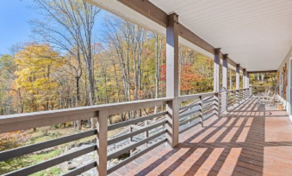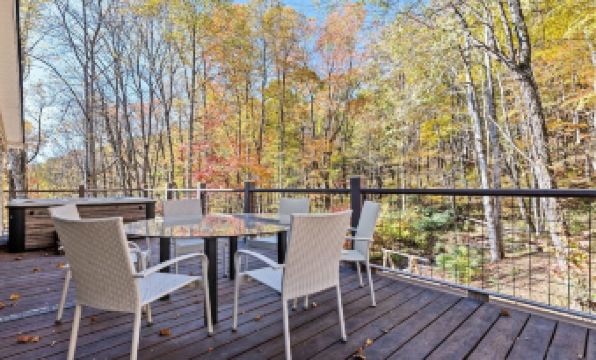 Perhaps the best features of this luxury cabin are the outdoor living spaces! The fabulous wraparound porch with a private hot tub will melt your stress away. Enjoy outdoor dining with a magnificent view! Below, you'll see our cozy fire pit right beside the the rushing creek on the property, complete with a waterfall. This space is sure to provide an unforgettable experience!