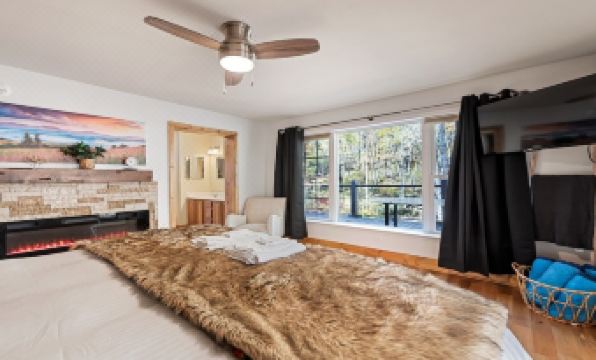 The Primary King Bedroom boasts majestic views of the waterfalls, and also has direct access to the hot tub deck. Relax and enjoy the large SmartTV at the end of your day.
