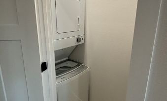 Walkthrough: Designated guest parking area with private walkway and entrance to the guest suite. Enter into the open concept dining room, living room, and well-equipped kitchen. Dining table with seating for 4. One bedroom and bathroom and laundry room on the ground floor, second loft bedroom at the top of the stairs.