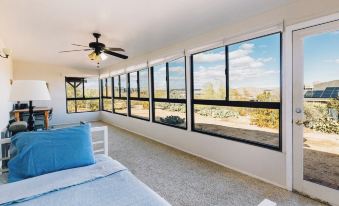 Escape to this fantastic house in picturesque Joshua Tree. This cozy retreat features 2 serene bedrooms with queen beds and 3 excellent bathrooms with modern amenities. Enjoy the additional space in the sun room with 2 twin beds for extra guests. Relax in the peaceful 1.5 acre surroundings and take in the beauty of Joshua Tree. We'll be available to answer any questions while you stay at our place.About pets:Pets allowed: less than 50 lbs per pet (limit one pet total).About children:Children allowed: ages 0-17.About smoking:Smoking allowed: in designated areas.About events:No events allowed.