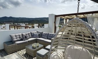 The penthouse consists of one bedroom and two full bathrooms, they are both equipped with hotel-quality bed linen and towels in order to maximize your comfortability. There is also a lovely open plan kitchen with all the equipment you can wish for such as a fully automatic coffee machine, juicer, dishwasher, toaster etc. The living room features a double sofa bed and a TV with netflix access. To top it all off the apartment has a lovely balcony and a rooftop terrace with a stunning sea view where you can sit and enjoy a dinner or a glass watching the sunset after a lovely day in the sun.