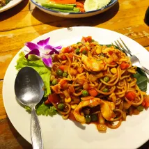Quietly situated, close to entertainment street. Friendly owners and nice garden. Cute cat and beautiful fish in the garden. Various trips can be booked at the Guesthouse, including to beautiful waterfalls. Breakfast can also be ordered.