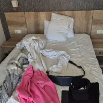 В описании указано, что кровать размера king-size, но на самом деле она 130 или 140 сантиметров в ширину, очень узкая для двоих. При заселении нам сказали, что в наличии есть только самый дорогой номер, но с помощью Trio.com мы выяснили, что есть номера и дешевле. Неприятно, когда пытаются обмануть. Номер очень чистый, но вода в душе льётся очень плохо.
