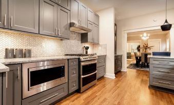 Our adult daughter lives in KC near the plaza and our family came together to visit and celebrate Thanksgiving with her. This home is beautiful and very well appointed. The kitchen was large and perfect for cooking a large meal for 11 people. The VRBO owners also let us rent the almost identical top unit to our extended family members and it was such a fun time of food, family, and fellowship. I would definitely stay there again in the future. The place was very tastefully decorated, comfortable and livable! Loved it!