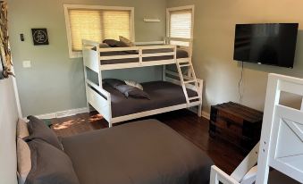 Nice home base for a local family reunion. The mattress in the front bedroom could have been firmer. But the kitchen was well stocked, everything was clean and it seemed like it could really accommodate a number of people with the bunk beds upstairs. Overall, a great experience. Would rent there again.