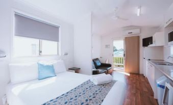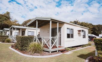 Absolutely beautiful spot... walk across the road to the beach. We stayed 3 niights in Cabin #4 it was ideal, fully self-contained, equipped with a small hot plate , full size fridge/freezer, microwave, sofa, queen bed, reverse cycle air-conditioning, very clean, a security sliding door, and little balcony with a table and chairs. TV & WIFI wouldn't work properly, a number of us mentioned this to the office staff. Small dogs are allowed inside the cabin.