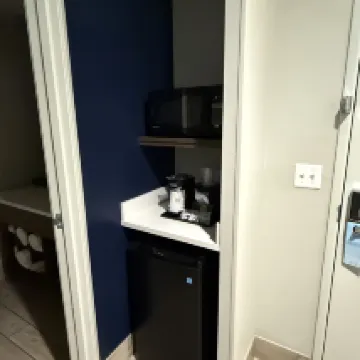 The facilities are very new, the bedding is average, the room is large, the breakfast area is very clean, there is a McDonald's next to it, it is cleaner without the carpet, there is a microwave and a small refrigerator