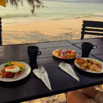 The resort's beach restaurant serves quality food with excellent value for money – we tried multiple dishes and enjoyed them all. However, there's no room service, and the restaurant closes early (around 9:30-10 PM). When late-night cravings struck, we found the nearby 7-Eleven (just 5-6 minutes' walk) convenient for snacks.