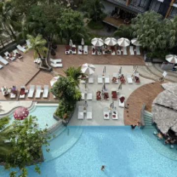 We had a relaxing stay. Upon arrival, we were welcomed with a refreshing matoom drink as our welcome drink. Our booked room is not yet ready upon check-in but luckily we received free upgrade and early check-in from front desk which is nice. The view from the room is outstanding. Some of room amenities is not in the room and has to be requested through the app or call front desk which is inconvenient. Wifi is not working sometimes I have to use my own data. Breakfast is a buffet and offer variety of choices. Swimming pool looks nice but we have no time to use it. After check-out they even allowed us to take a quick shower at the swimming pool area and a toilet to change our clothes before our flight. Recommend