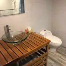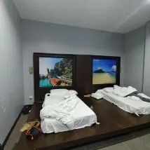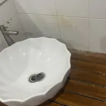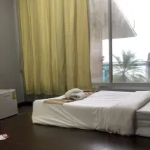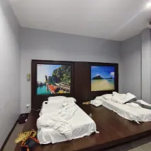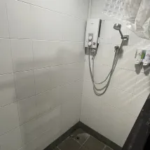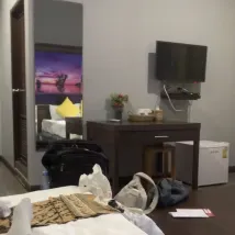 The room was very spacious and adequate for sleeping. The air conditioning worked well, the floor was clean, and the bed was spotless. The towels looked a bit dingy, making me hesitant to use them, though they didn't smell. No basic toiletries (soap, shampoo) were provided, nor was there a hairdryer. The room had a refrigerator, a TV, two complimentary bottles of water, and two glasses. However, the curtains and window panes had mold, and the room was quite dusty. The bathroom was spacious but had a somewhat unsettling vibe. The ceiling featured dark wooden slats. Although there was a water heater, the shower pressure was extremely weak, almost as if the fixture was about to break. The toilet also struggled to flush properly, with a very weak water flow.