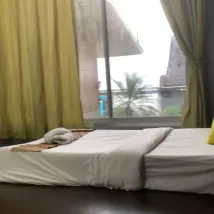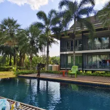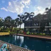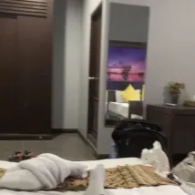 Clean, spacious, looks good. The room is very big, the price is very good. The location is a bit far from the city but it's not a problem. The swimming pool is awesome. The view behind is good and the atmosphere is very good.