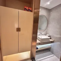 The room size was decent, but the layout was quite odd. The entryway served as a wardrobe, with the shower and toilet located on opposite sides of the entry hallway, and the vanity across from the toilet. This design meant one had to change clothes in the main room area after showering. Upon entering, there was a noticeable musty smell, which gradually dissipated after I opened the window for ventilation and turned on the air conditioning.