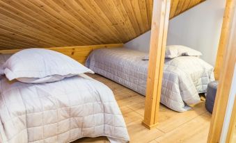 Two bedrooms on the ground floor, both with double bed. Two bedrooms in the loft, the first with 2 x 90cm wide beds and the second with one 120cm wide bed. In the lobby of the loft, 2 x 90 cm wide bed. The loft also has a lounge area.