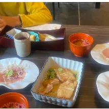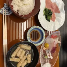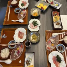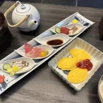 The breakfast was a bit unexpected (first time traveling in Japan), it was a full salty breakfast, sashimi, soup, etc. (with a small dessert). My 10-year-old child is not used to such a breakfast, and I am not used to eating sashimi in the morning, but it is a beautiful presentation. There is no coffee for breakfast.