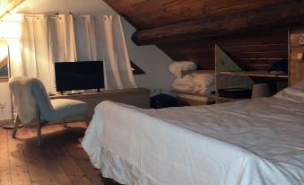 Under the roofs of this village house you discover an apartment on 2 levels with modern comfort and decoration typical of country houses, wood, old beams, stones, fireplace.