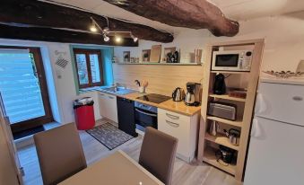 Quietly, our 4-person gîte is made up of three rooms with an enclosed garden offering a very beautiful view of a green landscape suggesting the rancid. The staircase is of period, like the visible beams.