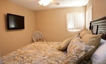 Bedroom 3 has a queen bed, tropical Tommy Bahama bedding, a 50" Roku Streaming TV on the wall and ceiling fan.