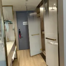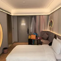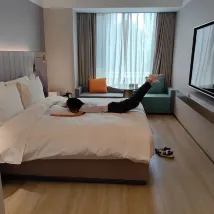 The moment you enter the room, you feel warm and comfortable. You feel right at home. What's most impressive is the interior design: modern, simple, luxurious, and intelligent. The Xiaodu voice assistant allows you to control almost every function in the room, which is fantastic! The bedroom, shower, toilet, and washroom are logically separated, each area conveniently positioned so it doesn't interfere with the other. The hotel's modern self-service laundry room and fitness room are fantastic. You can even work out while washing and drying clothes, without interrupting anything.