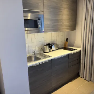 The kitchenette in the room was great! Perfect for business trips when I don't want to eat takeout; there's a Tesco nearby so I can buy groceries and cook for myself. The bed was decent, but I found some hair under the pillow. The hotel's location is also superb, with super convenient access to buses and subways, and tons of malls downstairs.