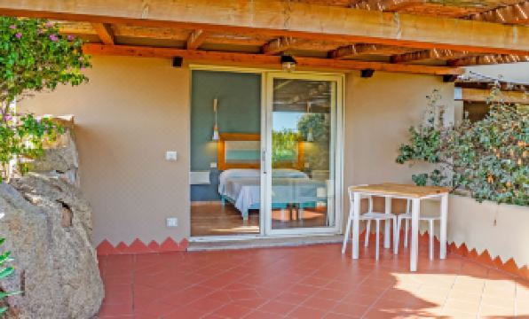 Child friendly resort "Lu Nibareddu". 3 km from the centre of Porto Taverna, 6 km from the centre of Porto San Paolo, in an elevated position on a slope, 1.5 km from the sea. For shared use: property with plants, natural garden, 2 swimming pools (18 x 6 m, seasonal availability: 01.May. - 31.Oct.). Children's pool, outdoor shower, tennis (extra), garden furniture. In the complex: reception, restaurant, bar, WiFi. Breakfast and half board possible (extra). Motor access (via unmade road). Central parking spaces. E-charging station. Shop 600 m, bus stop 500 m, ferry "Olbia" 20 km. Nearby attractions: San Teodoro 10 km, Olbia 18 km. Please note: car recommended. On request: airport transfer to the holiday accommodation. Please note: in the residences there is a paddle court (extra payment). "Mono 2 - Lu Nibareddu", 1-room apartment 22 to 25 m2. Simple furnishings: living/sleeping room with 2 sleeping facilities, dining table, satellite TV, air conditioning and forced-air heating. Kitchenette (4 gas rings). Shower/WC. Heating not available in all rooms. Balcony or terrace. Balcony furniture. Facilities: baby cot (extra). Maximum 1 pet/ dog allowed. IT090084A1000F2027