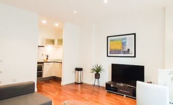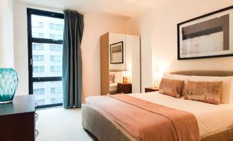 Modern apartment block "Discovery Dock". On the outskirts, 2 km from the centre of Canary Wharf, in a central position. In the house: reception, restaurant, bar, bistro, internet access, WiFi, shopping facilities, lift, central heating system, air conditioning, laundry (extra). Room cleaning weekly (included). Breakfast (extra). Bus stop "Cuba Street" 330 m, railway station "Canary Wharf" 2 km, underground station "Canary Wharf" 2 km. Nearby attractions: Billingsgate market 2 km, O2 Arena 4 km, London Eye 9 km, Greenwich market 8 km, Tower of London & Tower Bridge 5 km, Buckingham Palace 10 km. Please note: reception open 09:00-17:00 hrs. Baby equipment (extra), childminding (extra). Please note: 24hr guard. Guarded residence. The photograph shows a typical example. The holiday properties may differ in living space, floorplan, equipment and furnishing. "Discovery Dock", 2-room apartment 40 m2. Modern and stylish furnishings: living/dining room with dining table and TV (flat screen). 1 double bedroom with 1 double bed and bath/shower/WC. Open kitchen (4 hot plates, oven, dishwasher, toaster, kettle, microwave, freezer). Heating. Facilities: washing machine, dryer, iron. Internet (WiFi, free). Please note: non-smoking house. TV only EN. The property is one of a type of property or apartment.