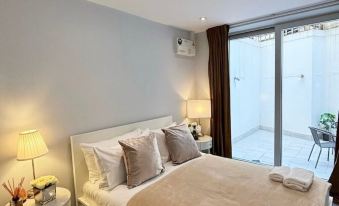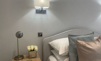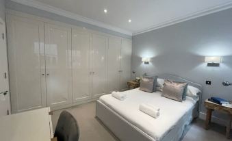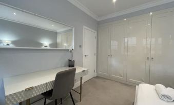 The two beautiful bedrooms have an elegant English interior one with a king sized and one with a queen sized bed along with plenty of storage space. The larger bedroom also comes with a desk to provide our guests with an additional private workspace. The elegant bathroom is fitted with a sink, toilet and a bath/shower and is decorated with a vanity mirror.
