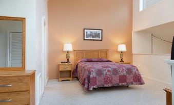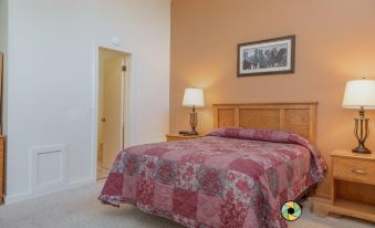This unit has a traditional kitchen with convenient dining either at the eat-at kitchen bar or a dining area adjacent to the living room and kitchen. A washer/dryer is also located in the downstairs hallway closet. The living room features a free-standing wood burning fireplace, rustic furnishings, a TV, and a sweeping vaulted ceiling up to the loft level. The downstairs bedroom includes a queen bed, walk-out access to the rear patio, and convenient access to the downstairs full bathroom. The large loft bedroom includes a queen bed, a bathroom with a steam sauna, access to the second-level balcony, and a TV. This home comfortably accommodates four but can sleep as many as six with the living room sleeper sofa.