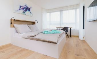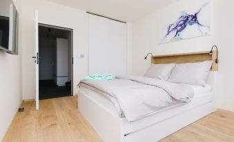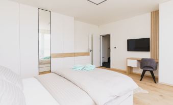 Modern, beautiful apartment block "Altabadia", 4 storeys, built in 2024. 1.2 km from the skiing area. For shared use: property. In the house: lift, central heating system. Storeroom available. Parking at the house. Supermarket 750 m, restaurant 1 km, bar 800 m, bus stop "Loučná, háj. Park" 1.2 km. Ski lift 1.2 km, chair lift 1.2 km, slopes 1.2 km, ski rental 1.2 km. Nearby attractions: Boží dar 6 km, Fichtelberg 8 km, Jáchymov 14 km. Well-known ski regions can easily be reached: Klínovec 1 km, Boží dar 6 km. Hiking paths: Krušnohorská magistrála, Ježíškova cesta, Naučná stezka Božídarské rašeliniště. "Bella Vista", 3-room apartment 86 m2. Spacious, beautiful and modern furnishings: living room with TV. Exit to the balcony. 1 room with 1 double bed and 1 pull-out bed. 1 room with 1 double bed and 1 pull-out bed. Kitchenette (oven, kettle, electric coffee machine) with dining table. Shower/WC. 2 balconies. Balcony furniture. View of the mountains. Facilities: Internet (WiFi). Please note: non-smokers only.