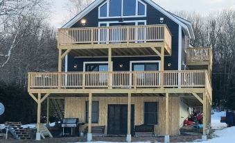Beautiful, well-appointed multi-level home. Great views of near and distant mountains. Very comfortable beds. TVs in every room. Large decks on two levels and side decks. We were there to see the ice go out in late mid-April. Plenty of kayaks, paddle boards, games, air hockey, etc. Very quiet and great for star gazing on a clear night.