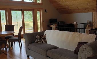 The house's unique character shines through its custom barn-and beam railings, yellow pine floors, and charming v-pine ceilings, blending modern elegance with rustic warmth for a truly special stay. While the walk-out basement is currently unfinished and used for storage and laundry, the living spaces above offer everything you need for a comfortable and memorable getaway.