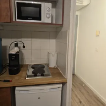 Conveniently located near the main station and a supermarket. The room was well-equipped with a microwave, induction cooktop, and frying pan, which was great. I also appreciated having a separate bathroom and toilet. (There was a mix-up during check-in where they didn't have a room with two beds ready for us, which caused some hassle, but I think the room we ended up getting was an upgrade.)
