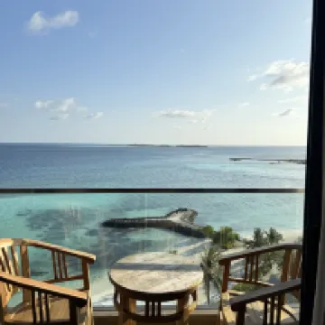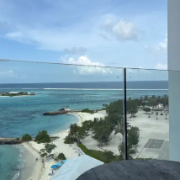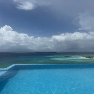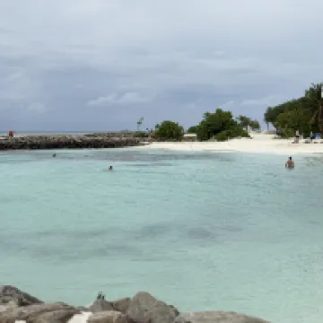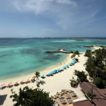 The hotel's beach is the most beautiful on Maafushi Island, and there's also a restaurant. The view from the rooftop pool is fantastic, but it rained during my stay, so my island hopping trip was canceled.