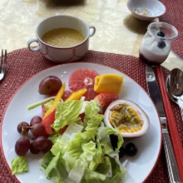 The room was spacious and the bed was comfortable. The toilet had a strong flush. Since it was off-peak season, we received two complimentary buffet breakfasts with our weekday rate. The suckling pig rolls and roast beef were of excellent quality and delicious, and there was also a wide variety of fresh fruit. We rode the cable car and watched the fountain show.