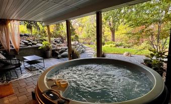 Once you arrive at Anchor Inn, you will walk along the LED illuminated grey stone path along the driveway and continue down the flagstone steps into the lush backyard. Your private patio sits just outside your front door and includes the hot tub to relax in with a drink.