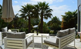 Villa Reve is a purpose built luxury holiday home. Set in park like grounds this gorgeous home offers every luxury you could want for but in a wonderfully relaxed atmosphere. Wake up to the sounds of tuis, doves, quail and take in the beautiful garden views. The bedroom with large King bed, luxurious linen and vast en-suite opens onto private deck. The galley kitchen offers superb cooking facilities. The fireplace in the outdoor dining area provides alternative cooking options as does the gas BBQ. This area is fenced to keep the wind out and for ultimate privacy.
