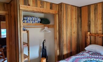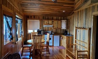 All Linens and Towels provided. Exchange service provided for longer than 7 day stays. Fully stocked kitchenette complete with coffee maker, coffee and filters. Microwave and full mini oven and range available in this cabin. Smart TV and DVD player in the cabin with access to DVDs to borrow. Can arrange kids toys if needed. Swingset and Monkey bars and Horseshoes available in the yard for outdoor play.