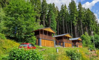 Comfortable bungalow detached. 7 houses in the resort. Outside the resort, in a quiet, sunny position, 50 m from the edge of the forest, 2 km from the skiing area. For shared use: natural state property, lawn for sunbathing, swimming pool (seasonal availability: 26.Jun. - 03.Sep.). Shower/WC in the pool area, table tennis, boccia, badminton, beach volleyball, barbecue, fireplace. Private: patio. In the complex: WiFi, billiard table, storage room for bicycles, sun terrace, storage room for skis. Parking at the house. E-charging station. Grocery 1.5 km, shopping centre 6 km, restaurant 5.5 km, bus stop "Mladé Buky" 1.5 km, railway station "Mladé Buky" 1.5 km, indoor swimming pool 10 km. Golf course (18 hole) 4 km, riding stable 3.5 km, walking paths from the house, cycle lane 50 m, ski rental 2.5 km, ski bus stop 50 m, ski school 2.5 km, children's ski school 2.5 km, sled run 2 km, cross country ski track 500 m, children's playground 50 m. Nearby attractions: zábavní park Baldův svět, 2.5 km, Rozhledna Eliška, tvrz Stachelberg 9 km, Stezka Korunami stromů Janské Lázně 10 km, Lanovka na Sněžku, Pec pod Sněžkou 18 km, Zoo Dvůr Králové, Adršpach 28 km, Vyhlídkové lety Vrchlabí, Kuks 30 km. Well-known ski regions can easily be reached: Mladé Buky 2 km, Janské Lázně 9 km, Černý Důl, Pec-Černá hora 15 km. Hiking paths: Krkonošský národní park. Please note: the photograph shows a typical example. "Lesní plovárna B2", 1-room bungalow. Comfortable furnishings: living/sleeping room with 1 x 2 bunk beds, 1 double bed, Scandinavian wood stove, dining table and TV (flat screen). Kitchenette (2 hot plates, toaster, kettle, microwave, electric coffee machine, Capsules for coffee machine (Tchibo)). Shower/WC. Electric heating, wood heating. Terrace. Terrace furniture, barbecue (portable), deck chairs. Facilities: Internet (WiFi, free). Please note: suitable for families. Non-smoking house. 1 small pet/ dog allowed.