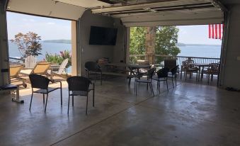 Two car garage, but with two extra garage doors on lake sides, best enjoyed for tables and chairs, 60" big screen television, refrigerator/freezer for handy cold beverages, plus deck and nearby large flat yard to work on your golf swing, enjoy 3 hole disc golf, or other outdoor fun!