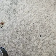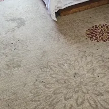 The carpeted floor, although comfortable, showed signs of wear and tear. Certain areas were stained, dirty, and in need of a deep clean.